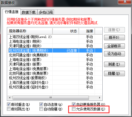 一直连接的是同一个行情服务器吗? 尝试把使用双数据的选项去除后再跟踪试试