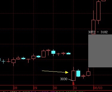 2009-7-31,白糖连续不除权数据,可以看到是大幅高开152点