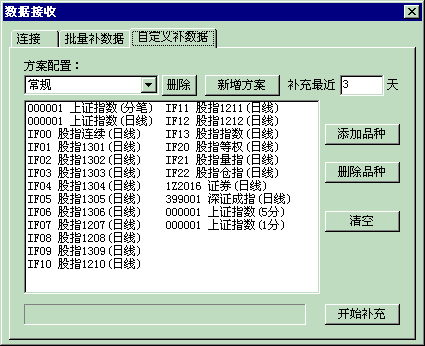 先到“数据接收->自定义补数据”中维护好要接收的品种和周期,接收的天数(如果天天接收就接收一两天就行了),就像1楼的图那样。