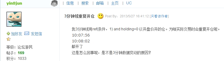 说明一下:5月27日我还有一个二次开仓,因为没有下单日志,所以当时被误诊了,那个下单从成交上看应该也具有上面的共性存在。我这两天浏览了一下论坛里面,有不同周期k下重复开仓的,有的是无头案,有的是信号闪烁,但无论如何这个都是的大问题,说是最重要的应该也不过分!不开仓可以,开仓后无法监测到不能平仓是个大事儿!