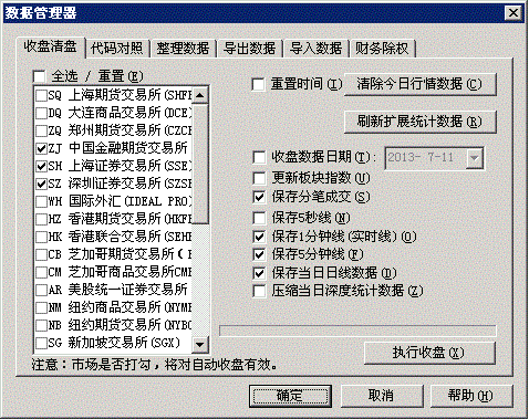 我设置收市后150分钟执行收盘,并在Ctrl+D界面勾选了上证、深证、中金这3个市场,结果,17:30分看到上海和深圳证券在收盘,17:45则没有看到中金在执行收盘,不知道为什么,我已经勾选了“ZJ”这个交易所了啊