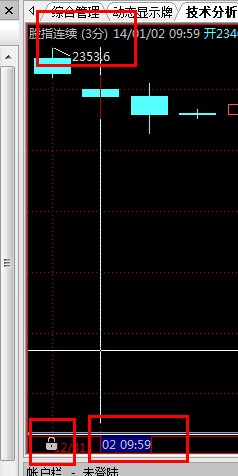 这是我在3分钟上划分的9:59:00 对应图上的9:59:00那根k 左边的锁是锁定。