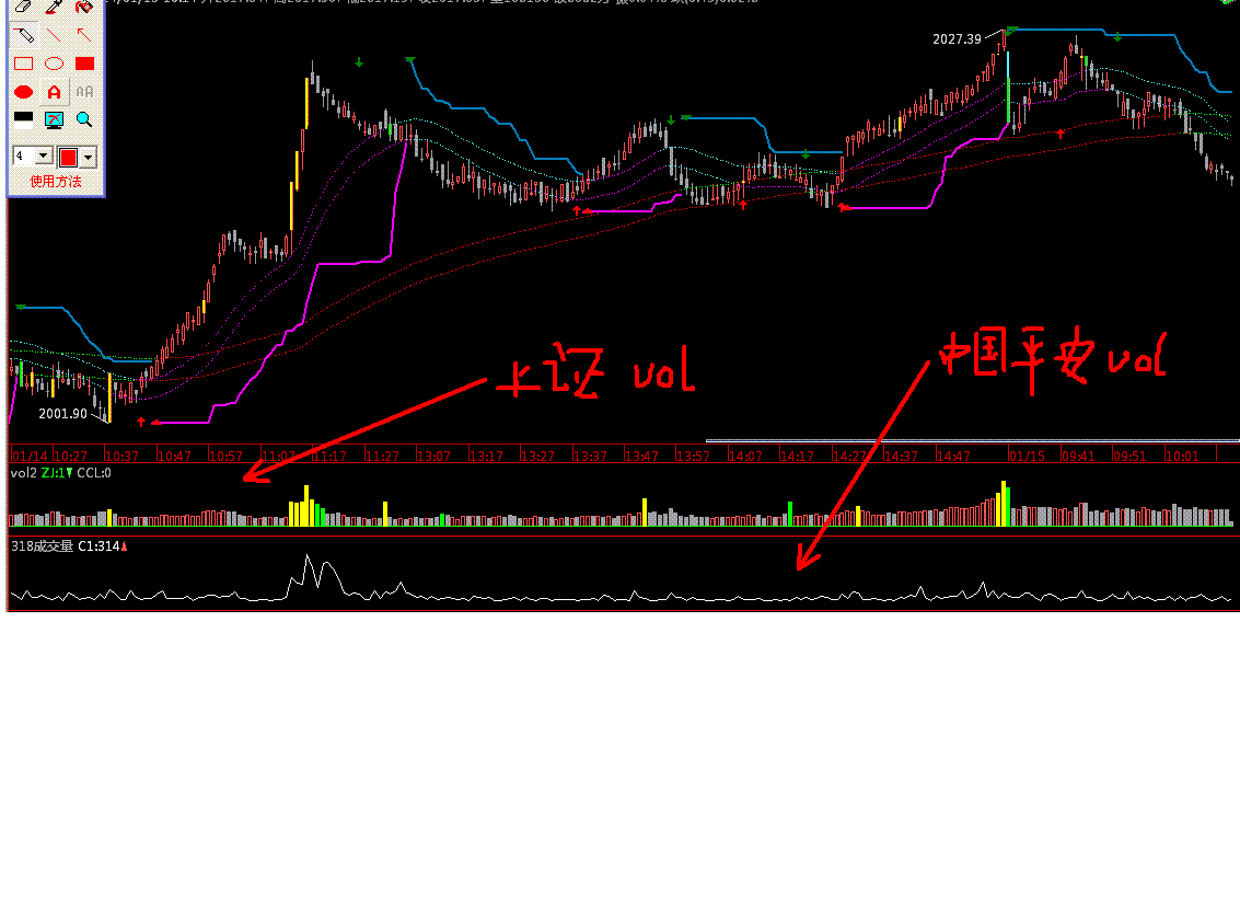 量的大小没问题,红绿柱和601318主图下的红绿柱不一样