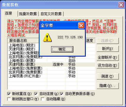 今天股票数据服务器长时间(超过2小时)停留在:天津网通1(股票)位置,一直显示“连接中”,未能连接成功,也未能自动切换到别的服务器。即使点中它也不行。当时天津网通1(股票)的IP地址显示为:222.73.126.190