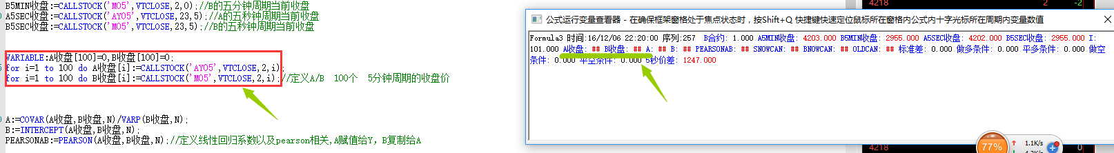 FOR i=1 to 100 do B收盘[i]=CALLSTOCK('B合约',VTCLOSE,2,-i);//定义A/B  100个  5分钟周期的收盘价
