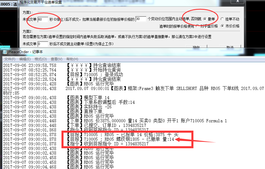 下单曰记已在2017-06-23 14:26:58.发出下单指令,后来显示超时等待 20 已清除了队列,此单一直没有平掉,反手持仓也没有开。另也设置了持仓同步,也没有起作用,请帮助看一下,那里设置有问题。我的思路是走完k,指定开盘价发出下单指令,30秒不成交,发出追单,追单必须要成交,怎样设置更合理?