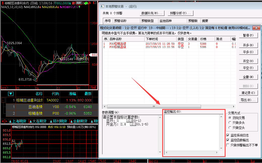打开下单日志后发现,晚上9点后都没有任何记录;白天哪怕不出交易信号,下单日志里也会记录每次轮询时的日志的,如:“2017-08-15 13:32:59.092    【后台】TA0002 运行结束”,但晚上就没有。