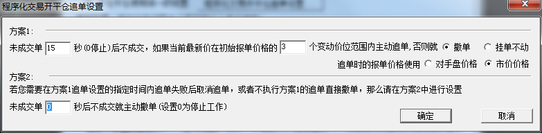 未成交15秒后3个变动价位追单否则就撤单,20秒后不成交主动撤单,持仓同步检测设置固定30秒