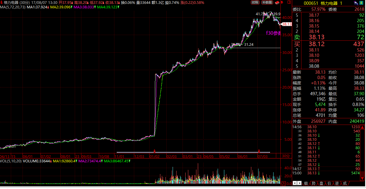 000651格力电器f15f30f60等分钟k线数据出现除权数据错误,请金字塔老师看看。