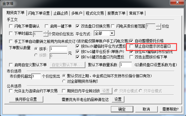 交易---下单设置,禁止自动显示状态窗口,这项勾上。