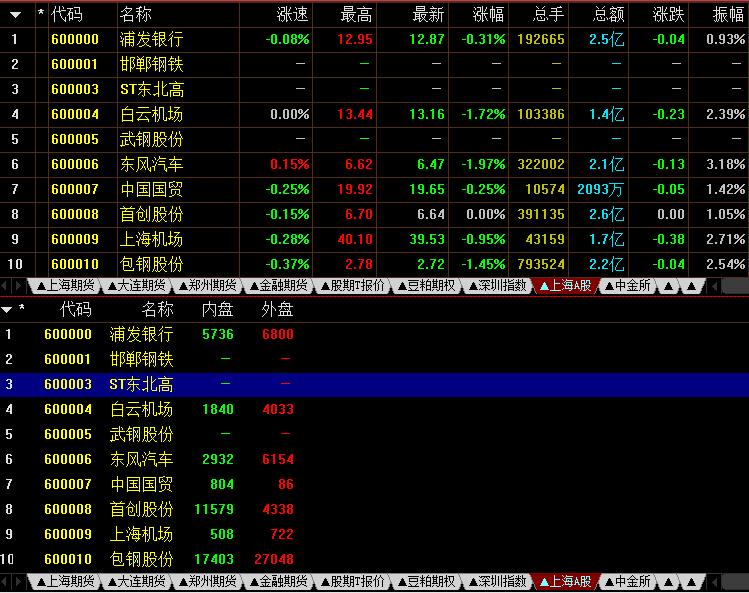自编框架:分页2个,2个都是上证股票,要求第一页表头为:最新,涨幅,总额,要求第二页表头为:外盘,内盘,能做到码?