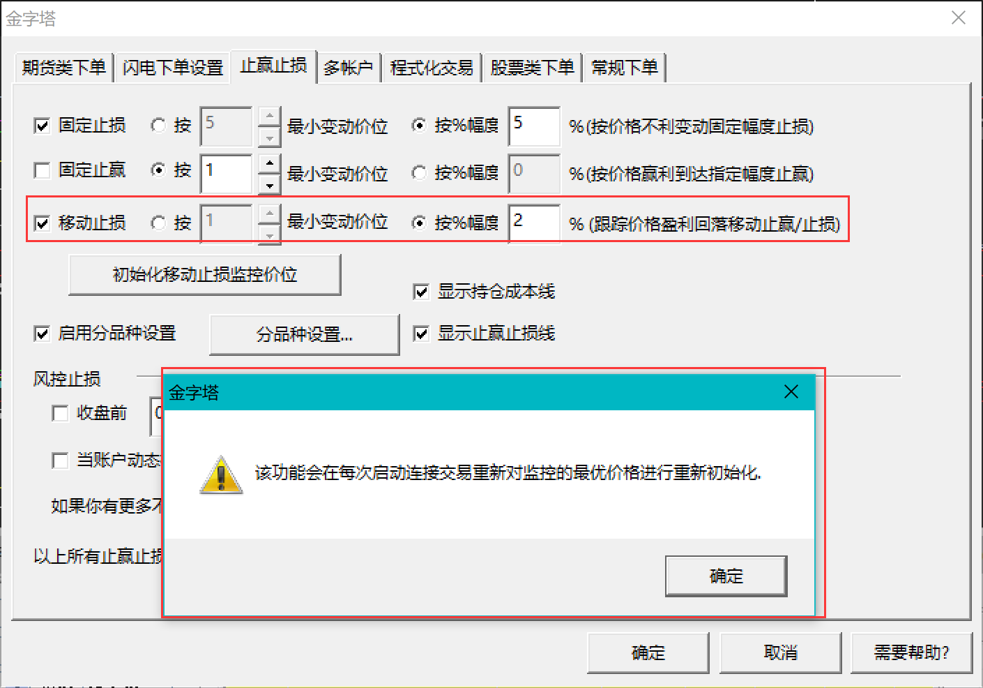2、勾选“移动止损”时,弹出提示框,“提示该功能会在每次启动连接交易生重新对监控的最优价格进行重新初始化”。