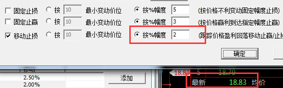 如图1,在最新价为18.83的时候,为该股票单独设置了移动止损(2%),其持仓平均成本为19.04。