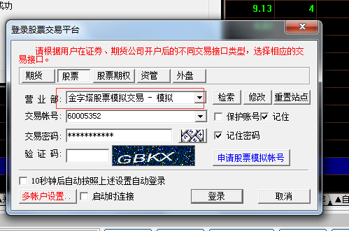 交易委托中,选择股票一栏,窗口的右下方有个“申请股票模拟账号”,申请成功后就可以使用