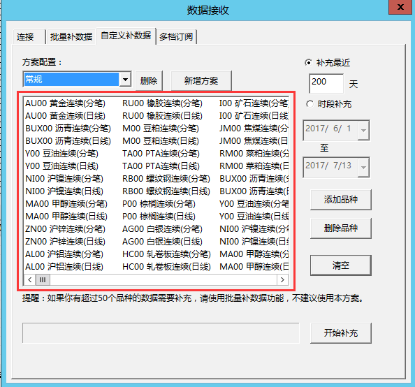 这个界面下方的提示已经提示的比较详细了吧,不建议超过50个品种的自定义数据补充。