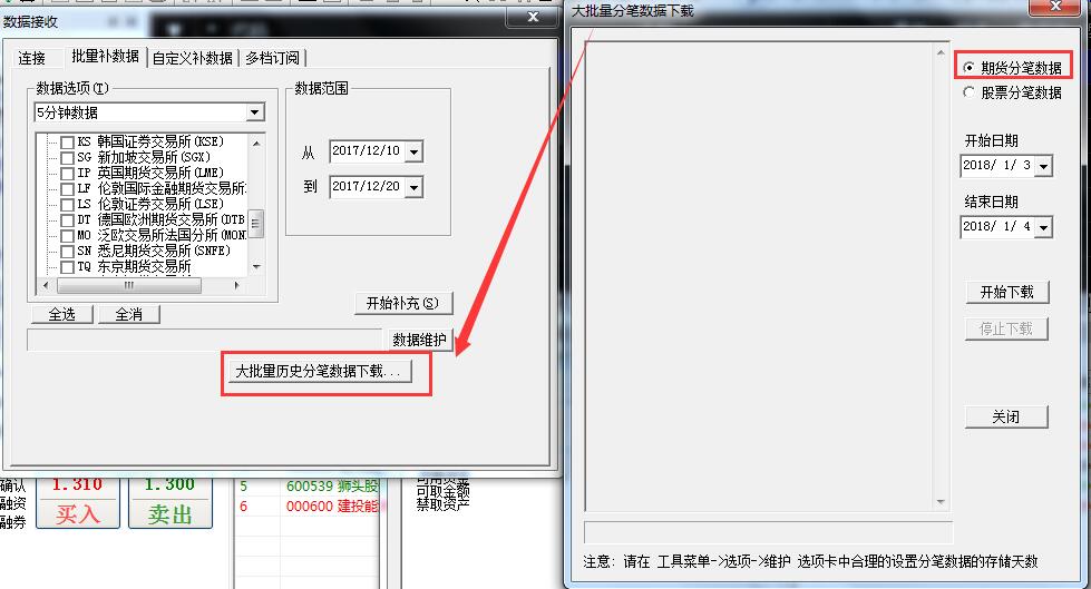 2. 通过数据补充中的“大批量历史分笔数据”来补充,然后选择一下相关市场和时间段;