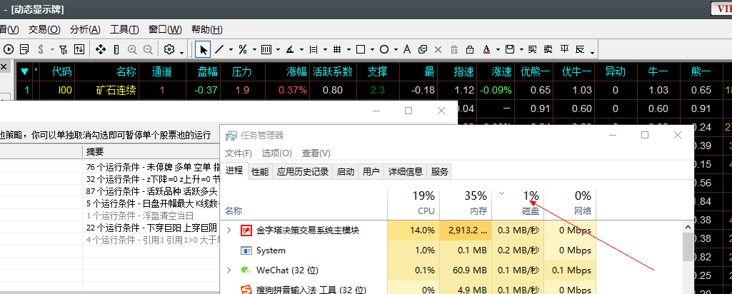 今天测试股票池效率,只要开启开仓模型的87个状态池,任务管理器磁盘就到100%,出现卡顿。关闭这87个股票池就回到5%以下。