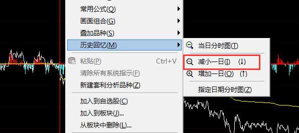 在分时图上,通过鼠标右键》 历史回忆 》 减少一日即可;然后通过键盘向下键,可增加多日分时图;