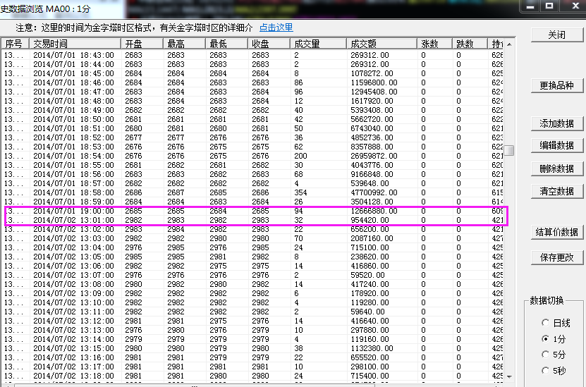 版主好,我补充了好多次数据,也按了F11键,但甲醇连续合约的1分钟数据, 2014年7月1日与7月2日始终有跳空缺口,导致回测数据不准确。