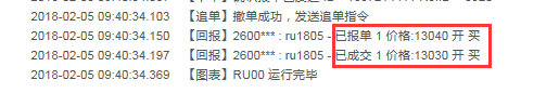 2018-02-05 09:40:34.197    【回报】2600*** : ru1805 - 已成交 1 价格:13030 开 买