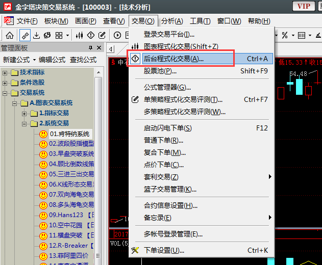 如下图,在专业版中显示的是后台程式化交易,在标准版中,这里显示的就是本地预警。两者的区别是前者可以根据预警信号直接下单交易,后者只是出预警信号,不能自动交易。