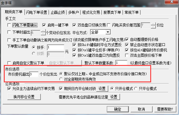 另外中金所是不支持市价委托的,实际是按交易设置中“超出几个价位”发出委托单的,您可以看下交易 》 下单设置 》 期货类下单 》 市价选项 ;
