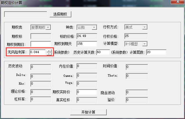 菜单栏分析 》 期权定价计算 》 可以修改无风险利润;