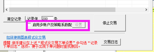 多账户如果配置外面勾选了,设置中未勾选交易账户的话,是不会下单的; 如果不用多账户,外面的勾不要勾选