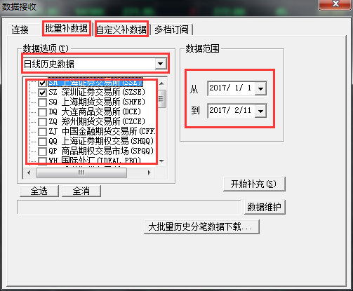 期货各周期的历史数据都是通过金字塔中数据补充来补充的,路径为 工具 》 数据补充 》 批量数据补充 或自定义数据补充;