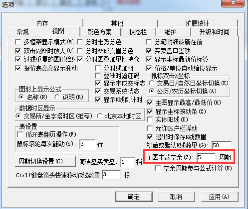工具---选项---视图,设置主图末端空余周期,如下图: