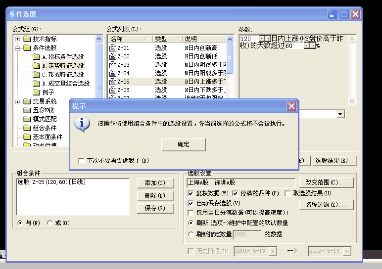 组合条件指的是两个以上的选股公式进行组合使用。如果你只使用1个选股公式,组合条件设置中就不需要添加,只需要在公式列表中选中公式。在设置选股范围,即可执行选股