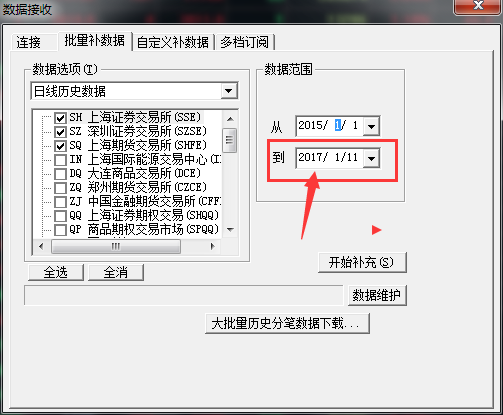 日线周期的历史数据如果是2017年之前的,都放在2017-1-3日这个数据包中,您只要将截止日期调整至2017-1-3日之后,会自动下载2017年之前的历史数据