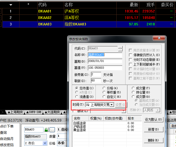 自定义板块指数历史上只能刷新日线,当天可以刷新分笔数据,需要补充好相应品种的日内分笔数据,另外你的板块指数的时间是如何设置的,需要与所选品种的交易时间一致。如下图: