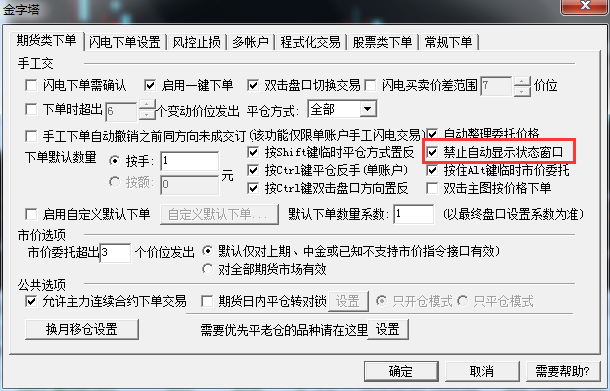 交易菜单--下单设置--期货类下单--将“禁止自动显示状态窗口”打勾
