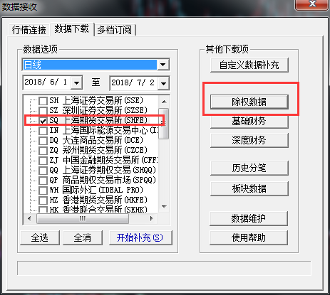 2,补充除权数据使用数据补充功能   可以选择除权数据补充,补充之前请先连接期货行情