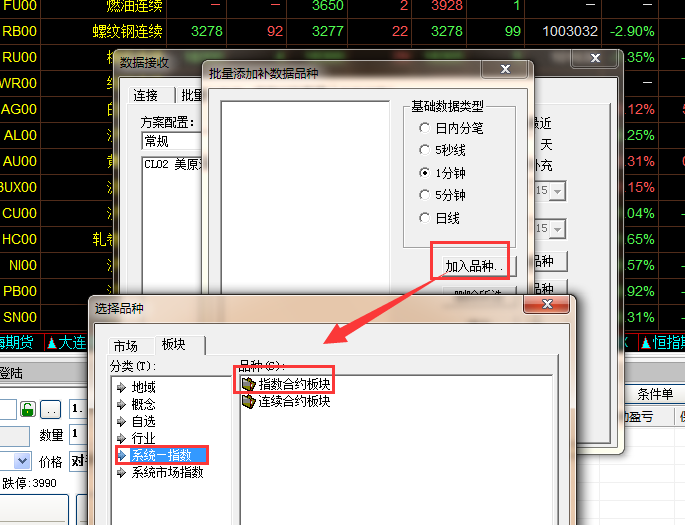工具-》数据补充-》自定义补数据里添加品种可以选择板块,如图