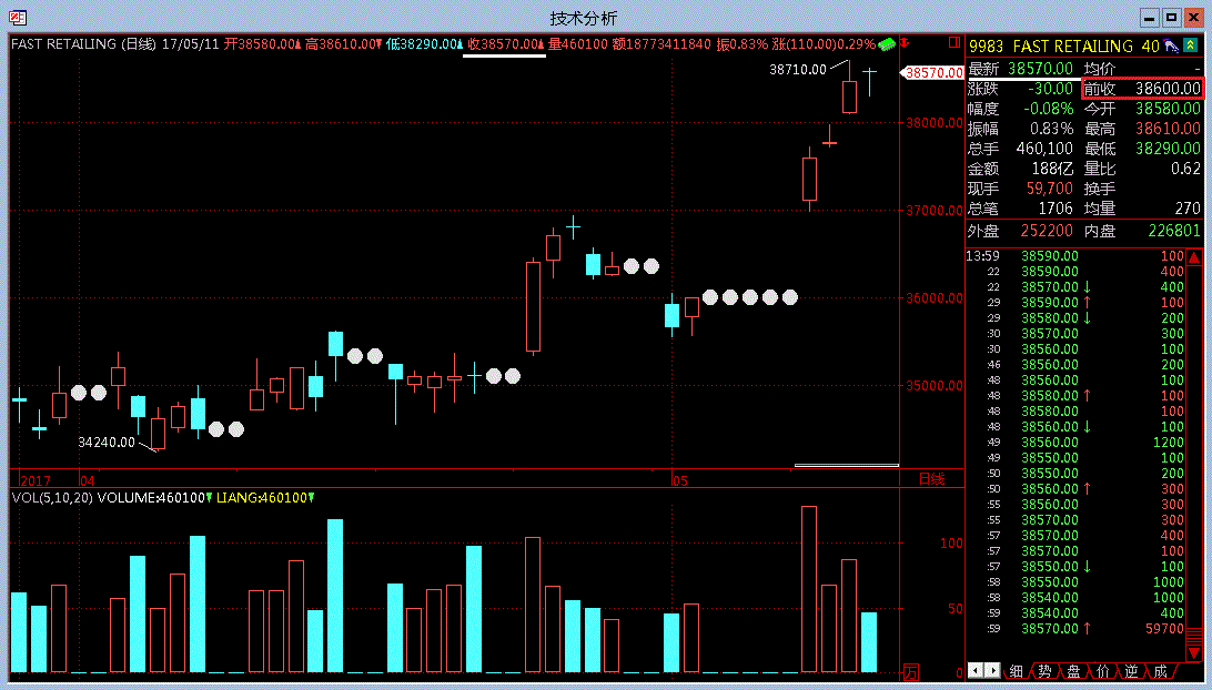 ib的软件以及通过金字塔的日K线(用其他周期K线也一样,查了所有周期的K线都没错)算出来都是涨了110日元,而金字塔系统算出来却跌了30日元