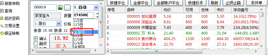 选中好股票,在数量中选全部开,就能计算出最大可买数量,如下图: