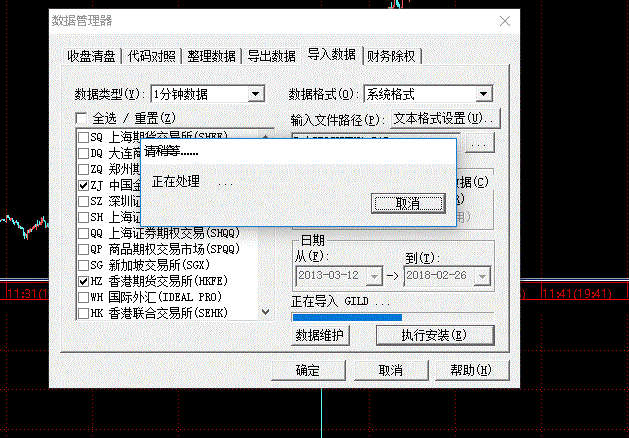 60M包含了三个期货市场一百多个品种1个月的1分钟数据,导一个月就要两小时啊,下图是一个小时前的截图(已经导了一个小时):