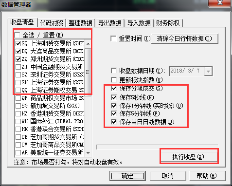 1. 通过工具 》 数据管理 》 数据管理器 》收盘清盘中,选择对应的市场和需保存的周期,进行执行收盘。此方法可以在15点之后操作,如下图: