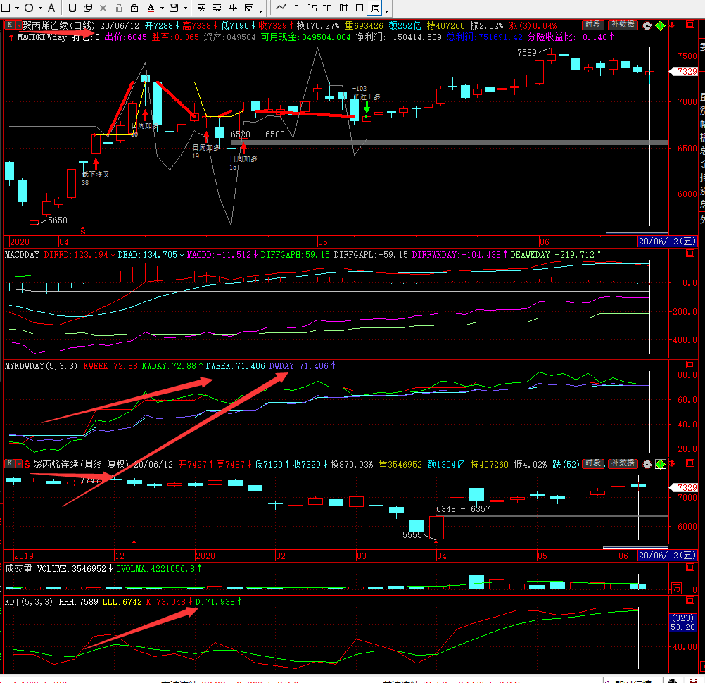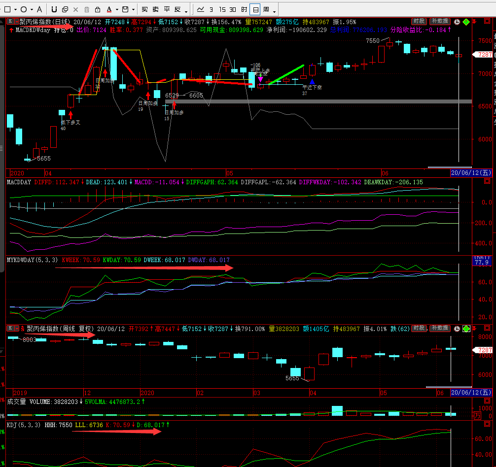 周线KDJ内容如下(参数:N=5,P1=3,P2=3):