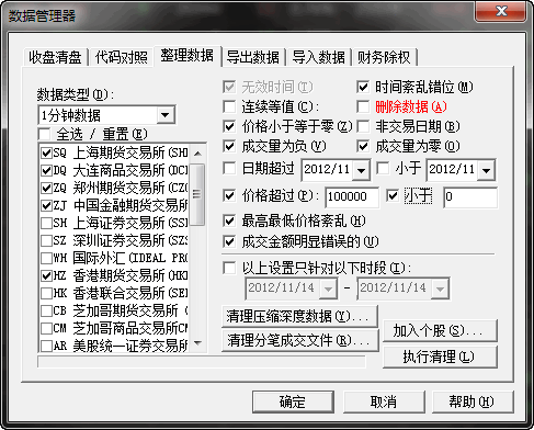 我发现豆油指数1分钟有几笔不正常的天量成交,我点补充数据也不能修正,于是打开了整理数据这个窗口。
