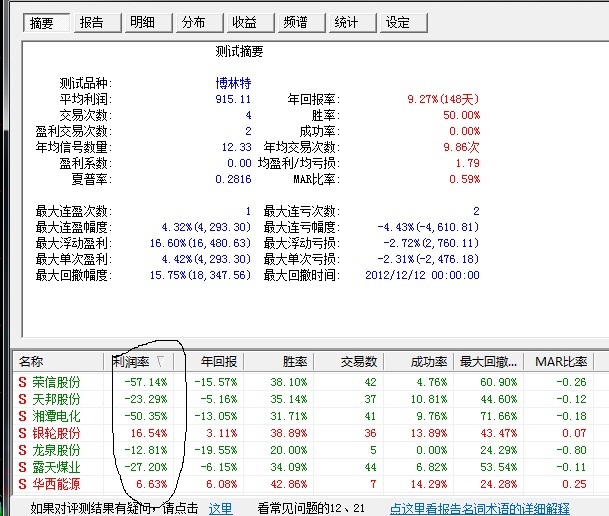 测试结果页中,在“利润率”栏点击,按利润率从高到低排列,但实际上,并不能得出从高到低的排列结果。经常是一些股票按测试结果利润率由高到低排列,又有一些混乱的夹杂其中(如下图)。