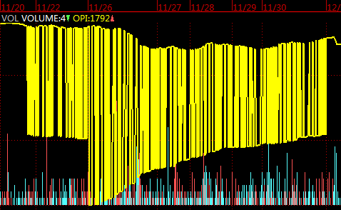 从TB导入的数据,已经做了时间修正,缩小K线时,也许是有遗漏还是别的什么原因,在缩小k线图时,有时候会变成附图这样。黄线是持仓量。