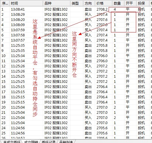 先发个简单的账户栏成交明细图,大概可先看一下上述情况(横长条红框处为系统自动平仓,因为勾选了“自动持仓同步”)