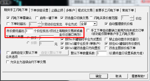 上海交易所的市价指令 金字塔默认是按照超3个市价指令发出的。用户可自行更改