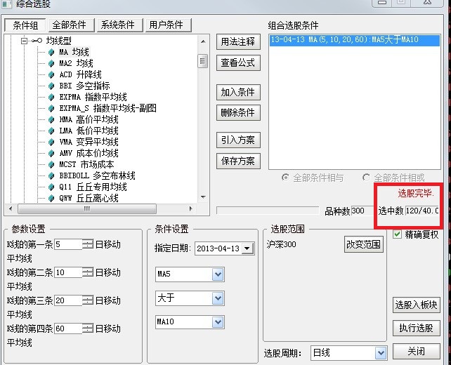 我在通达信是查找 沪深300中,MA5大于MA10的有几个如下图: