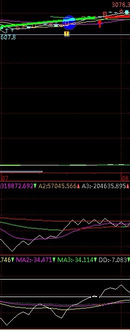下面这张图里最上面主图中圆圈内的买点与公式条件不合,因为最下面副图指标MA1(黄色线)既不大于MA2(水红线)也未上穿MA2,怎么这个位置出现买点呢?其后几天的红箭头买点是对的,此时副图上栏A1>A2,而其下面副图MA1上穿MA2。如果公式写法不错,为什么会出现错误的买点?