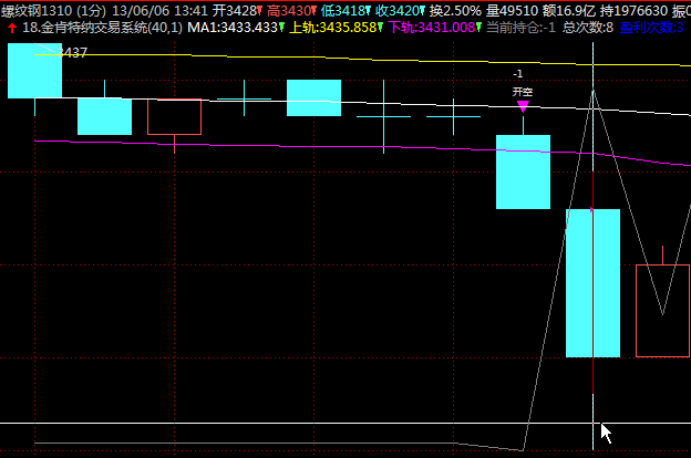 2、2013-06-06 13:40:59.703    【图表】触发下单(表示图中在运行的那根k线已经符合下单要求,因为我设置的是收盘信号,盘中动态收盘已达到下单要求) BUYSHORT 品种 RB10