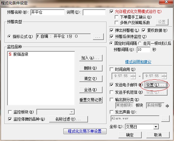 交易-后台程序化交易,然后随便弄个预警然后修改条件中测试下邮件发送是否可行。如果没有测试发送可能是您邮箱未开通smtp服务